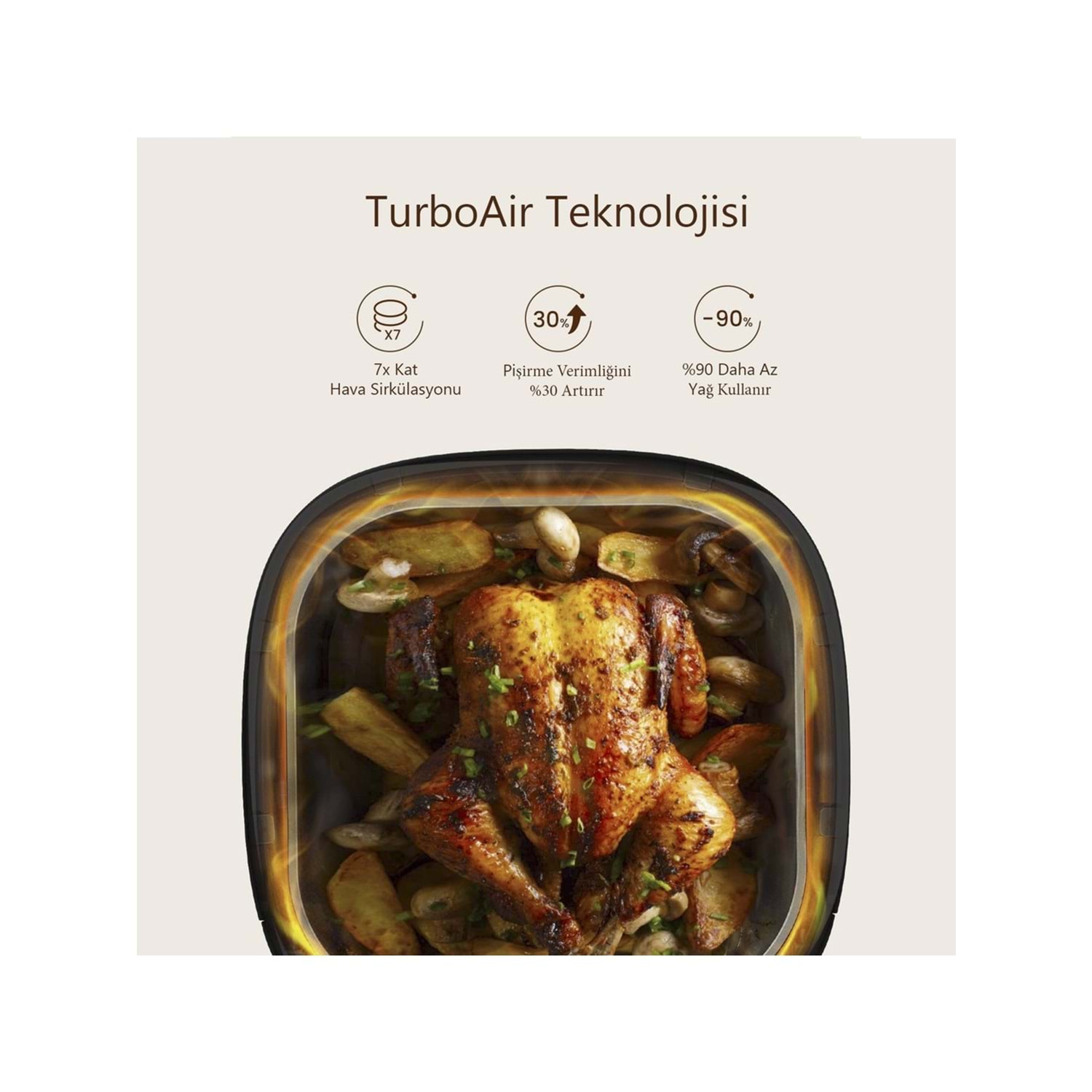 %99 daha az yağ kullanarak kızartma yapmanızı sağlar, geleneksel kızartmaya göre daha sağlıklı seçenek sunar.